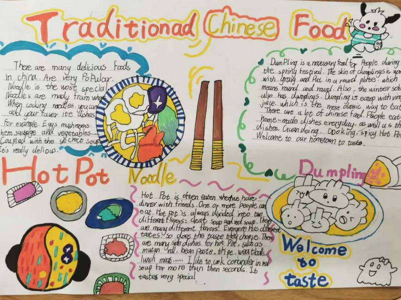 在英语学习方面,孩子们以创意方式学习英文字母与单词,结合英语学习与文化传播,学生们设计了中国美食主题的英文海报,向世界展示中国饮食文化的博大精深。