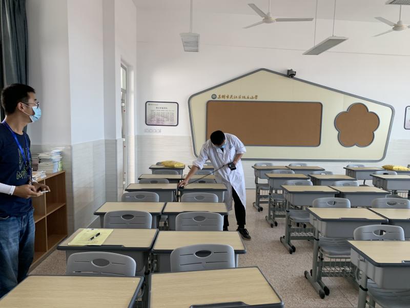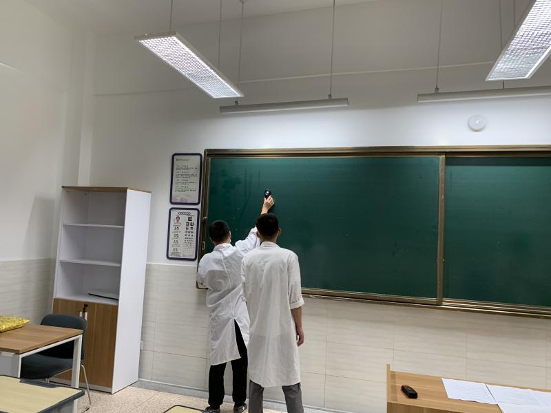 检测人员使用专业设备,对每间教室的桌面、黑板的照度及均匀度等指标进行精准测量。据了解,不合标准的照明可能导致学生眼睛疲劳,长期如此会影响视力。